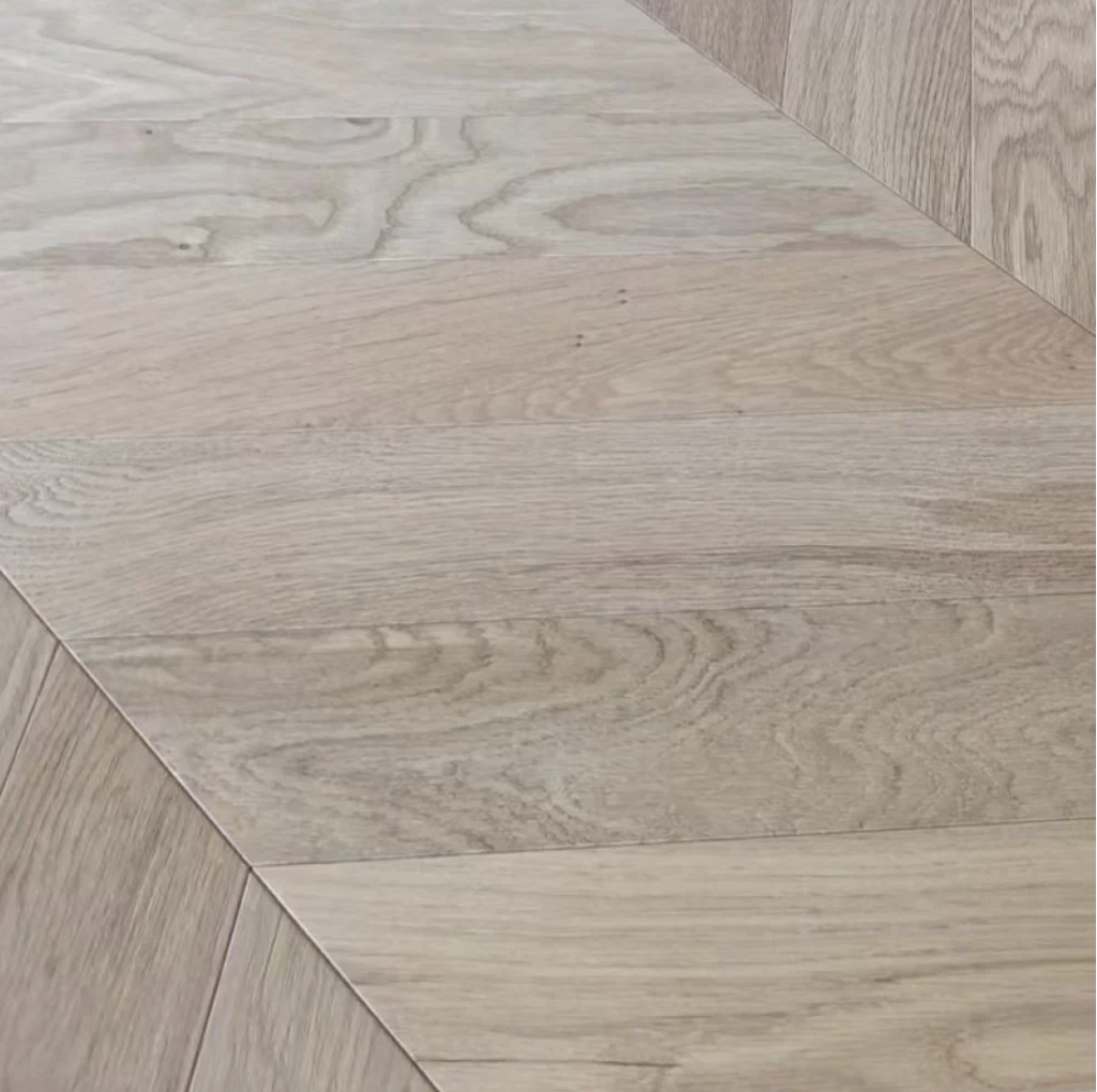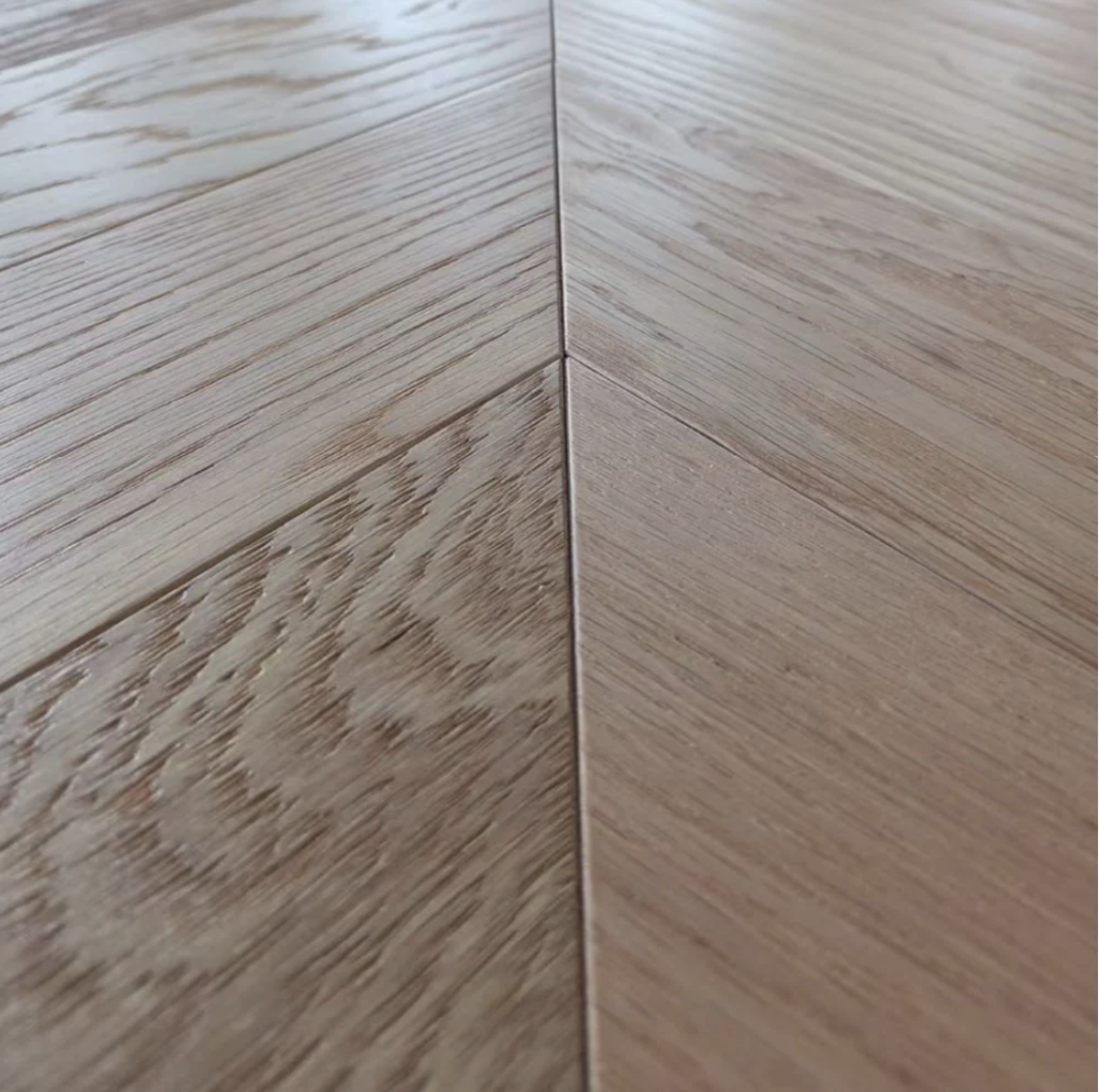 The Cambridge Chevron UV Oiled engineered oak wood floor has a wonderful appearance. This flooring has a striking chevron design that adds elegance and charm to any environment. The UV oiled treatment highlights the natural texture and colour of the oak wood while giving long-lasting protection from daily wear and tear. The chevron pattern in a multi-engineered oak wood is designed at 45 degrees, making it perfect for underfloor heating. Order a sample to get a better look.